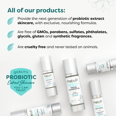 • UNIQUE INGREDIENTS. We use a unique probiotic lysate (probiotic extract) to act as a skin protectant as well as other key ingredients including fruit and botanical extracts and essential oils. • SKINCARE YOU CAN TRUST. We provide the next generation of probiotic extract skincare free of: GMOs, parabens, sulfates, phthalates, glycols, gluten & synthetic fragrances. Cruelty free.