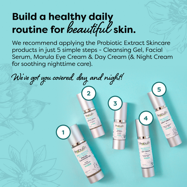We recommend applying the Probiotic Extract Skin Therapy products in just 5 simple steps - Cleansing Gel, Facial Serum, Marula Eye Cream & Day Cream (& Night Cream for soothing nighttime therapy).