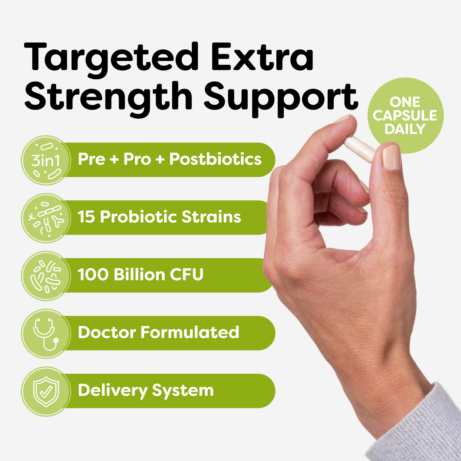 When your digestive system feels vulnerable and your natural balance has been disrupted, you need more than just standard support to help you feel like yourself again. This extra-strength, doctor-formulated blend provides a concentrated 100 Billion CFU dose to help you bounce back quickly and with confidence. By thoughtfully combining a diverse 17-strain probiotic blend with nourishing prebiotics and protective postbiotics, we offer a total care system that focuses on both immediate replenishment and the long-term strength of your gut barrier. It is a gentle yet powerful way to restore, rebalance, and protect your internal defense system when you need it most.