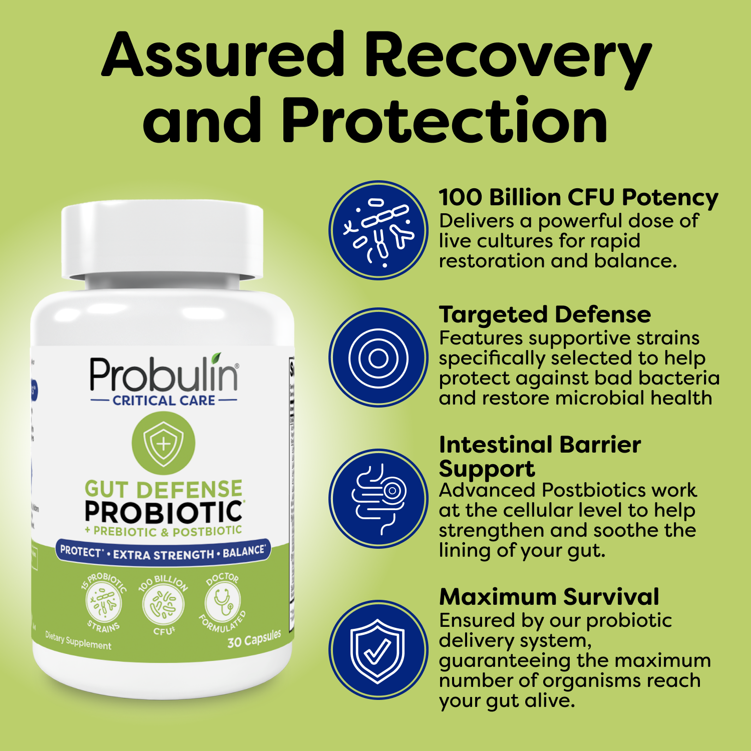Gut Defense provides a high-potency, 100 Billion CFU "Total Care" system designed to restore your microbial balance after antibiotic use or severe disruption. This doctor-formulated blend uses 17 diverse strains, including the resilient S. boulardii, to shield the gut from harmful bacteria while prebiotics and postbiotics work together to nourish and strengthen the intestinal barrier. To guarantee these live cultures reach the colon alive, our specialized probiotic delivery system bypasses harsh stomach acids, ensuring your system is rapidly replenished and protected when you are most vulnerable.