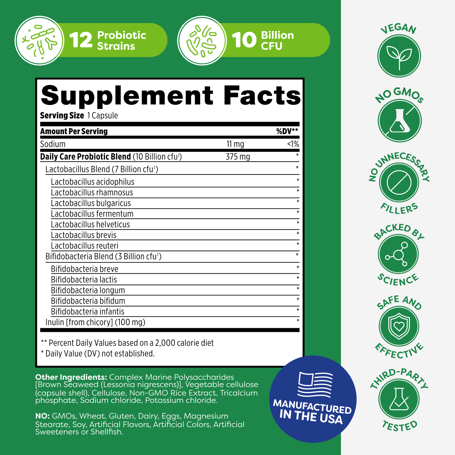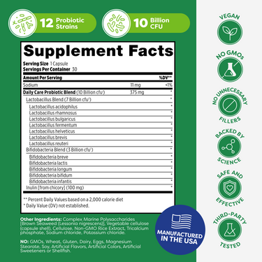 When delivered properly, anything more than 10 to 20 billion cfu (colony forming units) may be unnecessary. With Daily Care, you're consuming a 12-strain probiotic blend with 10-billion cfu that always delivers properly hydrated and activated probiotics when the time is right, thanks to our Probiotic Delivery System.
