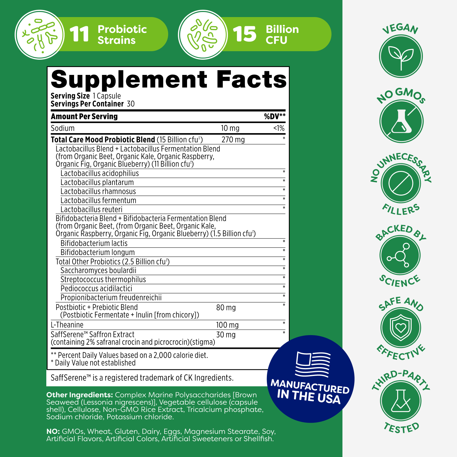 Our formula provides comprehensive support by combining a high-diversity mood probiotic blend with calming botanicals. The specialized protective barrier ensures maximum survival of beneficial bacteria without using harsh synthetic coatings.