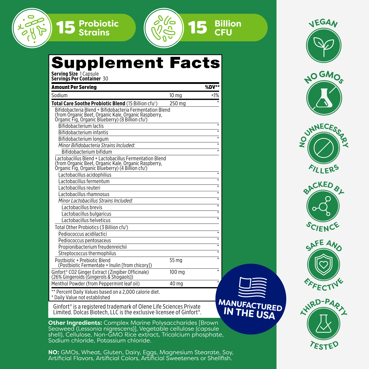 While many supplements only provide bacteria, Soothe combines 15 diverse probiotic strains with concentrated Ginger and Peppermint. This dual-action approach physically soothes the digestive tract while the probiotics address the underlying bacterial balance. Our specialized seaweed-extract layer protects these delicate ingredients from stomach acid, ensuring they reach the gut where they can be most effective.
